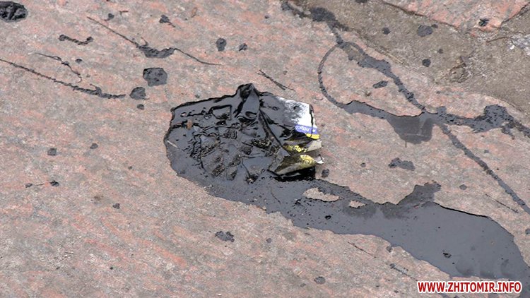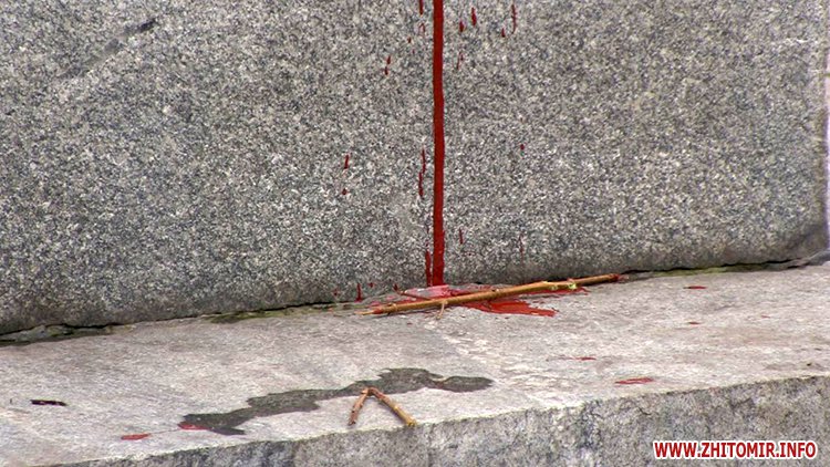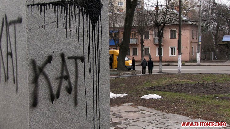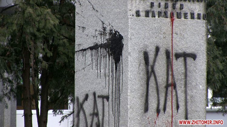 Чотири надписи «Кат» і плями червоної та чорної фарби з’явилися 28 лютого на пам’ятнику Олександру Пархоменку у Житомирі.