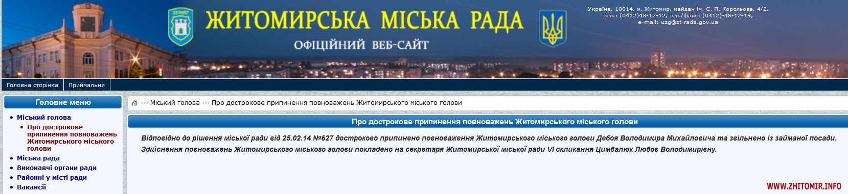 На официальном сайте Житомирского горсовета нет никакой информации о тех, кто сейчас руководит городом.