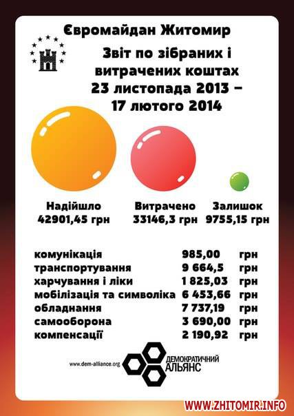 - Якщо говорити за попередній період, то там основна стаття затрат – транспортування людей у Київ. Це заправка машин, оплата проїзду людей на Майдан і бензин для генераторів. Плюс в незначній частині, звісно, харчування, мінімальні ліки, типу протизастудних і вітамінів. Багато «потягнула» символіка. Зокрема, ми замовили величезну коробку стрічок (60 рулонів) в Одесі за 1800 гривень. Наче багато, але цілий рулон стрічки там коштував стільки ж, скільки в нашому магазині коштує метр. Але це ми говоримо про ті 40 тисяч. Витрати значно збільшилися, коли почав функціонувати революційний штаб в ОДА. Саме тому ми пішли. Потім 40 тисяч ми переказали на рахунок благодійного марафону, який запустив «5 канал». Ці кошти підуть на допомогу постраждалим. А решту ми вирішили віддавати родинам загиблих – по три тисячі гривень. Зокрема, днями наші їздили у Володарськ-Волинський, щоб передати гроші. Зараз якраз шукаємо інформацію про загиблих з Житомирщини.