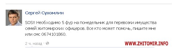 Подібне оголошення розмістив на своїй сторінці у Facebook і перший заступник мера Житомира Сергій Сухомлин.