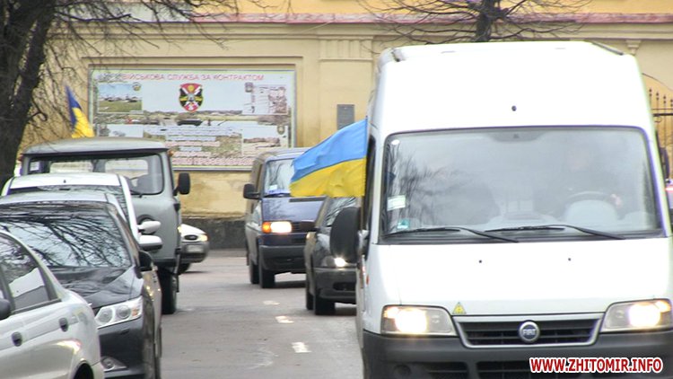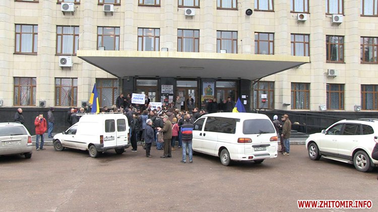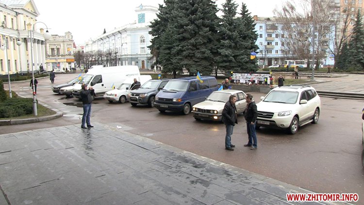 Півтора десятка автомобілів рішуче їдуть до Житомирської облдержадміністрації і зупиняються впритул до центрального входу.