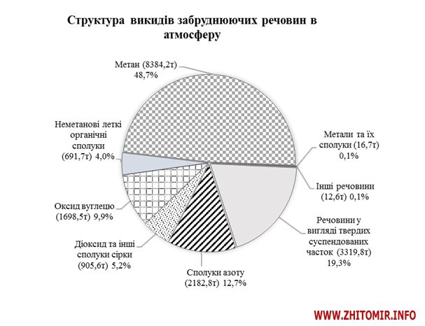 Найбільше викидів діоксиду вуглецю в атмосферу області потрапляє від КП «Житомиртеплокомуненерго» (198,7 тис. тонн, або 26,9% загальнообласного обсягу), Бердичівської філії управління магістральних газопроводів «Київтрансгаз» (120,3 тис. тонн, або 16,2%), ТОВ «Церсаніт-Інвест» (48,7 тис. тонн, або 6,6%), комунального підприємства теплозабезпечення м. Коростеня (40,4 тис. тонн, або 5,5%), КП «Бердичівтеплокомуненерго» (32,6 тис. тонн, або 4,4%).