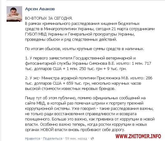 «По итогам обысков, изъяты крупные суммы средств в наличных. У первого заместителя Государственной ветеринарной и фитосанитарной службы Украины Симонова изъято: 1 млн. 717 тыс. долларов США, 1 млн. 250 тыс. грн, 9 тыс. евро. У экс-министра аграрной политики Николая Присяжнюка изъято 286 тыс. долларов США, 659 тыс. грн, несколько наручных часов высокой стоимости известных мировых брендов», - сообщил Аваков.