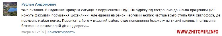 - Вчора вже дали вказівку начальнику ДАІ, будуть внесені зміни до дислокації несення служби по Радомишлю, але ще будемо вивчати ситуацію, можливо там дійсно є якісь порушення в плані організації дорожнього руху, так звані «ловушки». В Радомишлі сьогодні по штату 4 працівники ДАІ.
