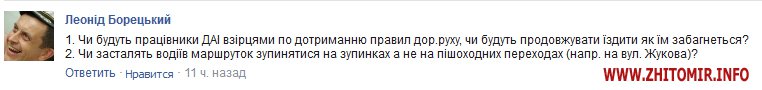 В Житомирі велика кількість напрямків маршрутних перевезень, маршрутки зупиняються коли і де їм заманеться (по за межами зупинок), цим самим створюючи незручності іншим учасникам дорожнього руху, а по декуди просто виникають аварійні ситуації! Більше того велика кількість маршрутів курсує по вулицях де взагалі відсутні зупинки громадського транспорту, наприклад на вулиці М.Рибалка починаючи від вулиці Щорса зупинок не має ВЗАГАЛІ, а маршрутки їздять і зупиняються посередині дороги, щоб їх обїхати доводиться виїзджати на полосу зустрічного руху, а в зимовий період ще гірше, така ситуація в місті складається РОКАМИ!!! Коли буде наведений лад???