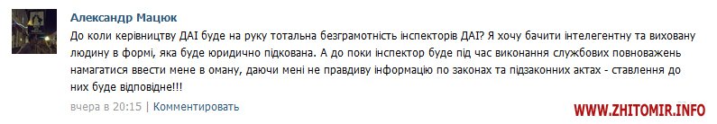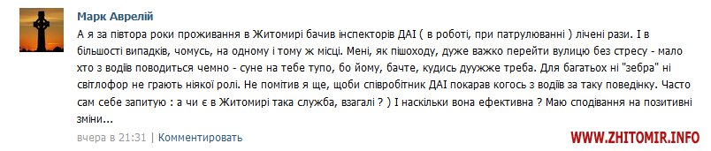 - Через брак працівників ДАІ ми не в змозі зараз взятися за все, в Житомирі по обслуговуванню міста працює взвод, штатною чисельністю 20 осіб. Сьогодні є домовленість з Держтрансінспекцією, будемо залучати їх, бо вони мають більший вплив на перевізників, ніж працівники ДАІ.
