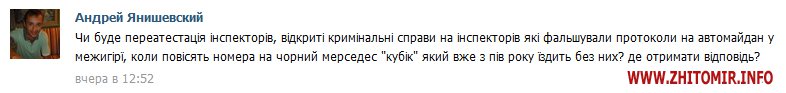 Я тоже попросил бы руководство ГАИ проверить автомобиль Мерседес GL, который то с номером 0017 МІ ездит, то, вообще, без номера и отчитаться перед житомирянами. Со стороны видно, что там мажоры ездят как попало и в непонятно каком состоянии...