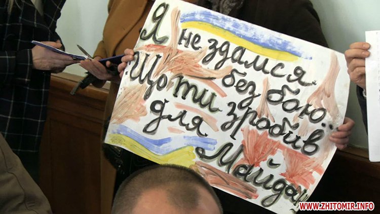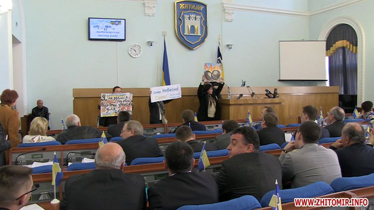 С плакатами в руках на сессию горсовета пришли несколько активистов, которые выступают против возведения маркета «АТБ» в историческом центре Житомира. Они ходили на заседания временной депутатской комиссии, которая изучала законность строительства. Говорят, что накануне сессии комиссия завершила свою работу и теперь люди просят депутатов запретить строительство магазина, а на этом месте обустроить сквер в честь Героев Небесной сотни.