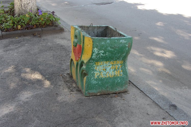 Как сообщал Житомир.info, новые урны для мусора на улицах Житомира не продержались и года. 154,6 тыс. грн. для приобретения мусоросборных урн были выделены в конце лета 2012 года. За эти деньги в ОАО «Житомирский комбинат силикатных изделий» купили два вида урн – для улиц и скверов по цене 256 грн. и 320 грн.