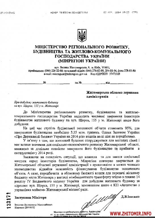 На початку квітня цього року інвестори дізналися, що кошти з державного бюджету на добудову об’єкту по вул.Щорса, 155, ступінь готовності якого становить 95%, виділятися у 2014 році не будуть. Мінрегіонбуд пропонує Житомирській облдержадміністрації «віднайти можливість фінансування будівництва зазначеного об’єкта».