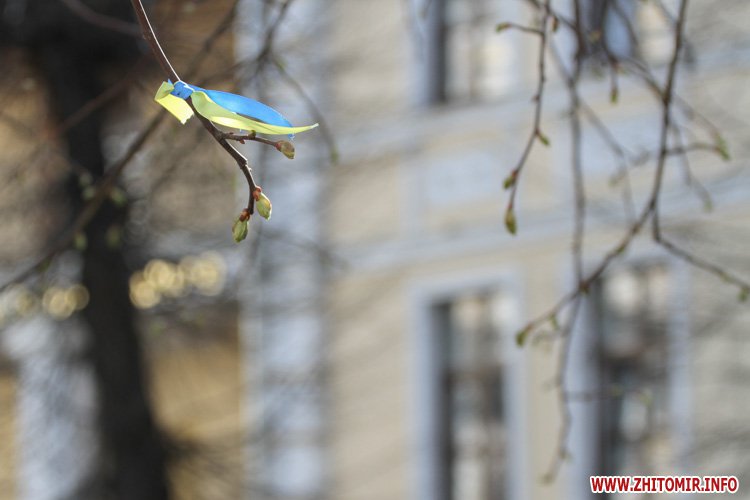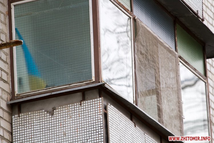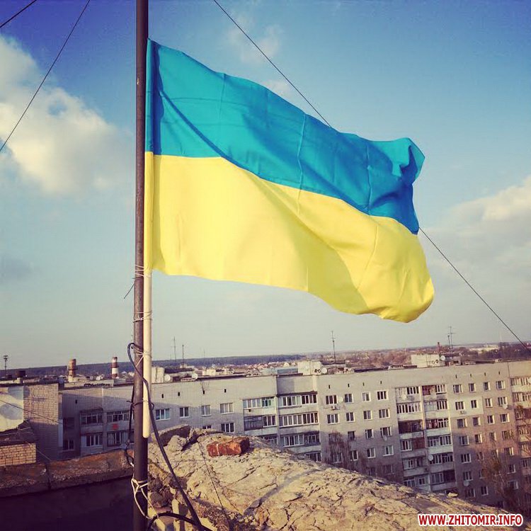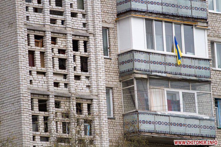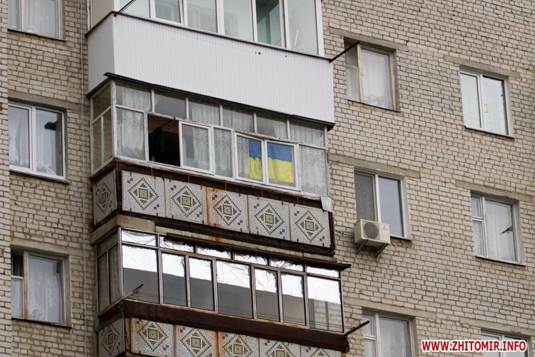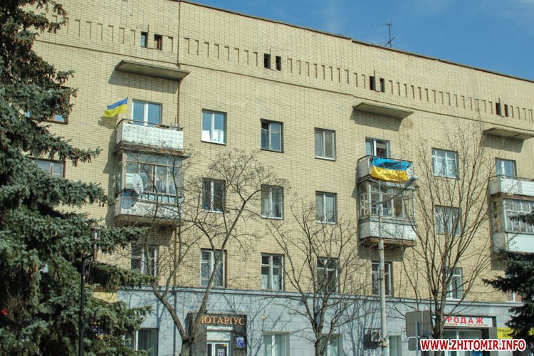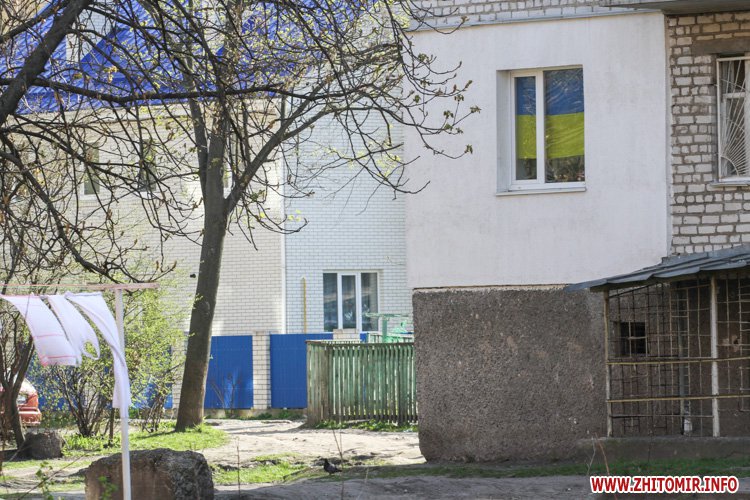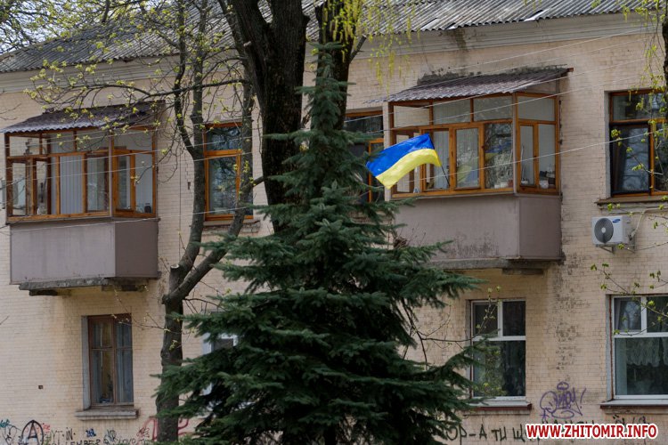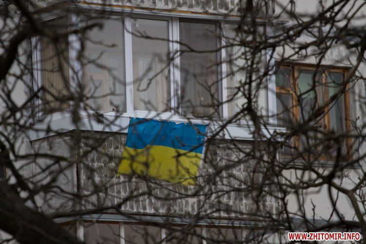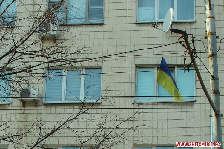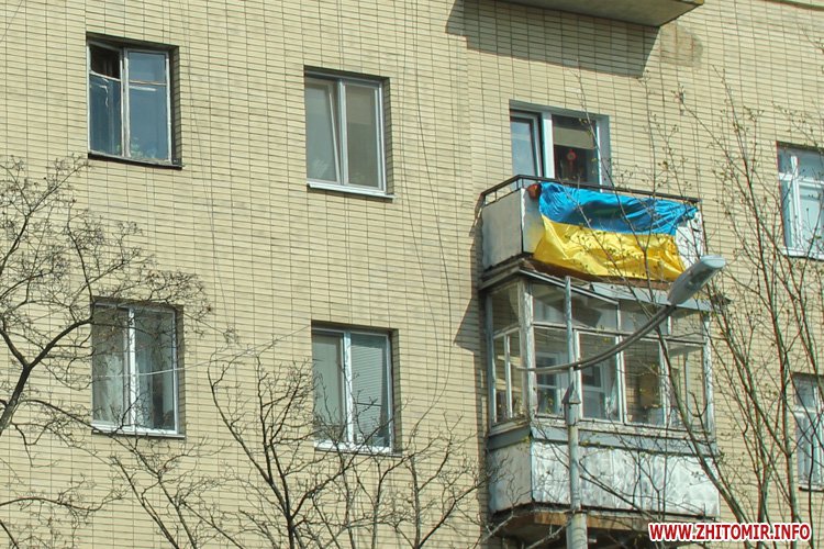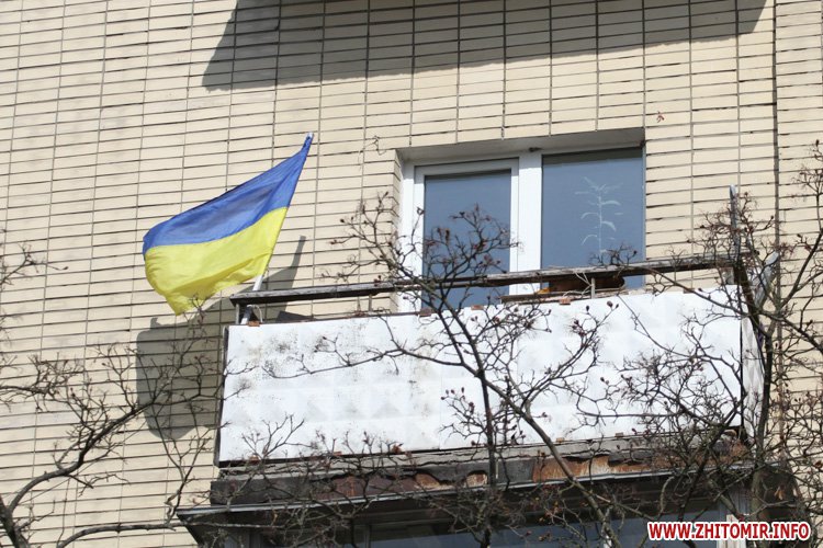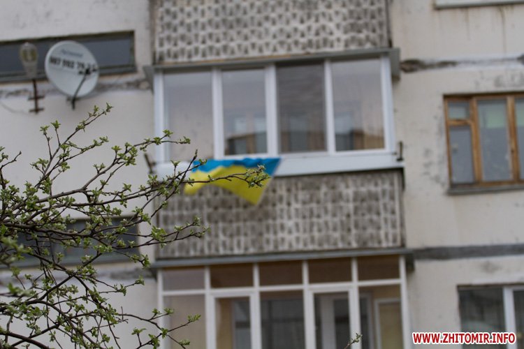 У Житомирі на житлових багатоквартирних будинках з’явилися державні прапори. Стяги видніються на вікнах, майорять з балконів, розвіваються на дахах будівель.