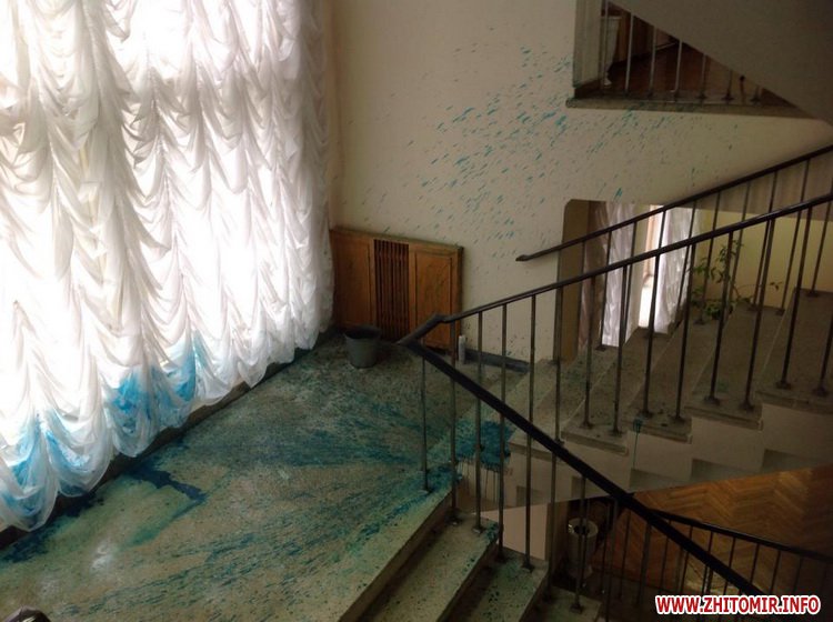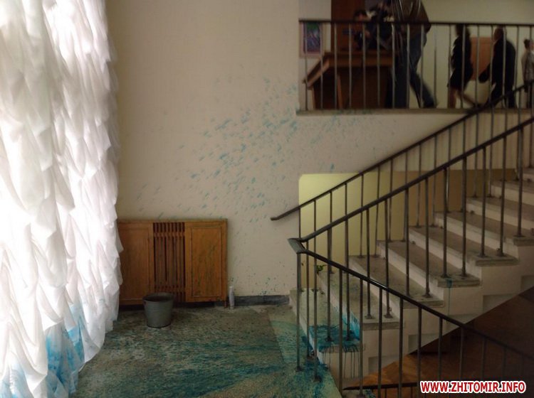 Во время перерыва сессии Житомирского облсовета 10 апреля экс-губернатора Сергея Рыжука облили зеленкой.