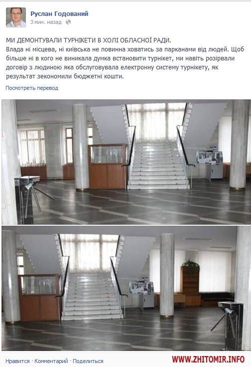 «Мы демонтировали турникеты в холле областного совета. Власть ни местная, ни киевская не должна прятаться за заборами от людей. Чтобы больше ни у кого не возникала мысль установить турникет, мы даже разорвали договор с человеком, который обслуживала электронную систему турникета, как результат сэкономили бюджетные средства», - написал Годованый.