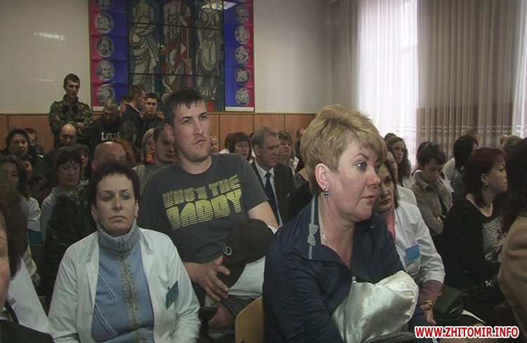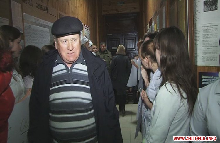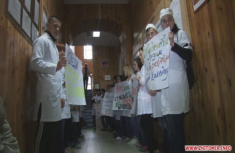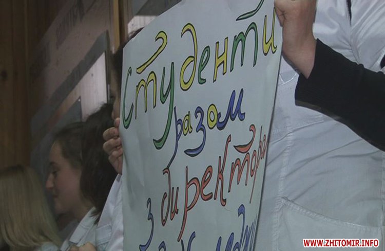З плакатами в руках на підтримку директора Бердичівського медичного коледжу студенти зустрічають людей, які прийшли вимагати його звільнення.