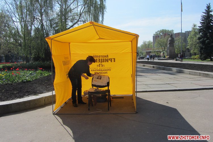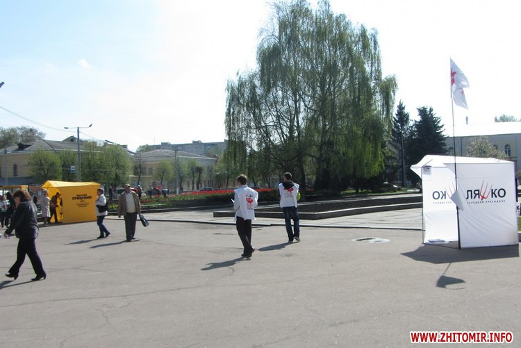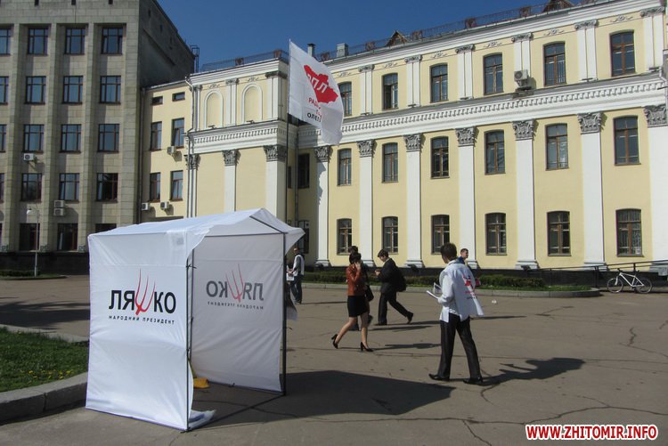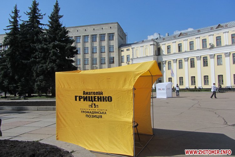 Агитационные палатки кандидатов в президенты Украины Олега Ляшко и Анатолия Гриценко появились утром 22 апреля на площади Королева в Житомире.