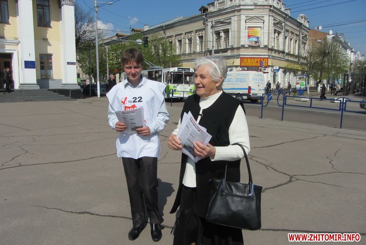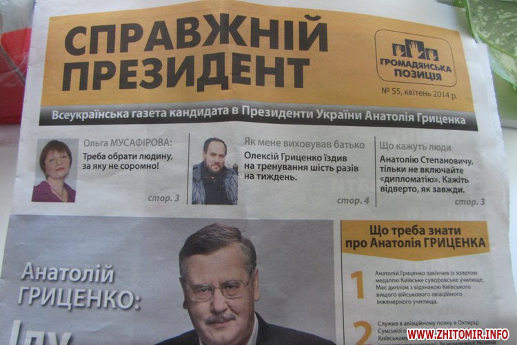 Людям раздают печатную продукцию – первый номер вестника Олега Ляшко «Боротьба» (тираж – 10 тис. экземпляров) и №55 всеукраинской газеты кандидата в президенты Украины Анатолия Гриценко «Справжній президент» (тираж – 410 тыс. экз.).