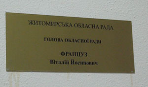 В Житомирском областном совете уж точно два председателя и каждый работает в своем кабинете. На втором этаже, где расположены кабинеты руководителя и заместителей председателя Житомирского областного совета с сегодняшнего дня находится два кабинета на которых указано, что там работает председатель. На одном кабинете, где уже много лет работает председатель – висит табличка с фамилией В. Француза, который был избран председателем на сессии областного совета 1 февраля.