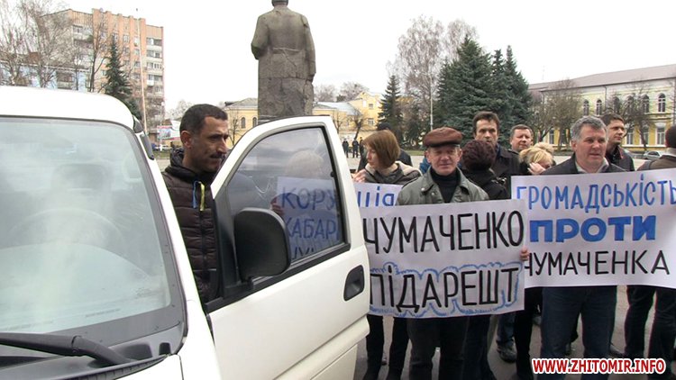 Напомним, что 20 марта активисты местного Автомайдана пикетировали облгосадминистрацию и требовали не назначать Анатолия Чумаченко прокурором Житомирской области. 4 апреля несколько сотен активистов пикетировали областную прокуратуру и добились, что все заместители прокурора, в том числе и первый заместитель Чумаченко, написали рапорты на увольнение. После увольнения в конце февраля Валерия Шкуро, Анатолий Чумаченко исполнял обязанности прокурора области.