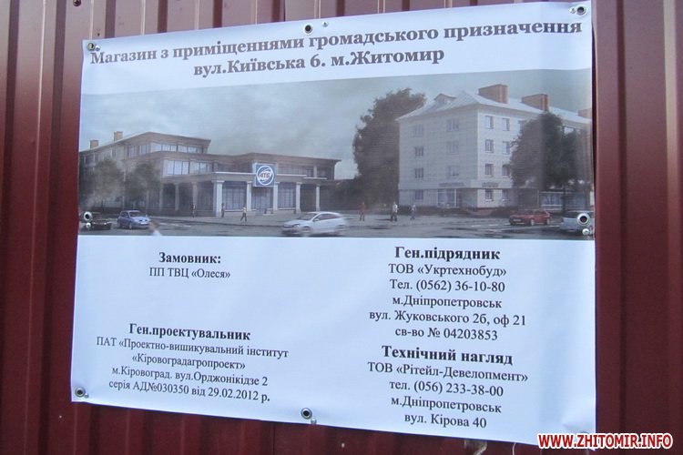 Напомним, в апреле 2013 года в центре Житомира, на углу улиц Киевская-Театральная начали строить продуктовый маркет «АТБ». Архитекторы Житомира написали мэру Владимиру Дебою открытое письмо с требованием приостановить издевательство над архитектурой города. Но мэр ответил, что не может запретить строительство АТБ в центре Житомира. Народный депутат Геннадий Зубко заявил, что власти города самовольно разрешили строить маркет АТБ вместо культурно-административного центра, и направил в прокуратуру запрос о строительстве на ул. Киевской, 6.