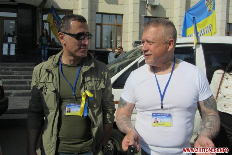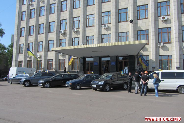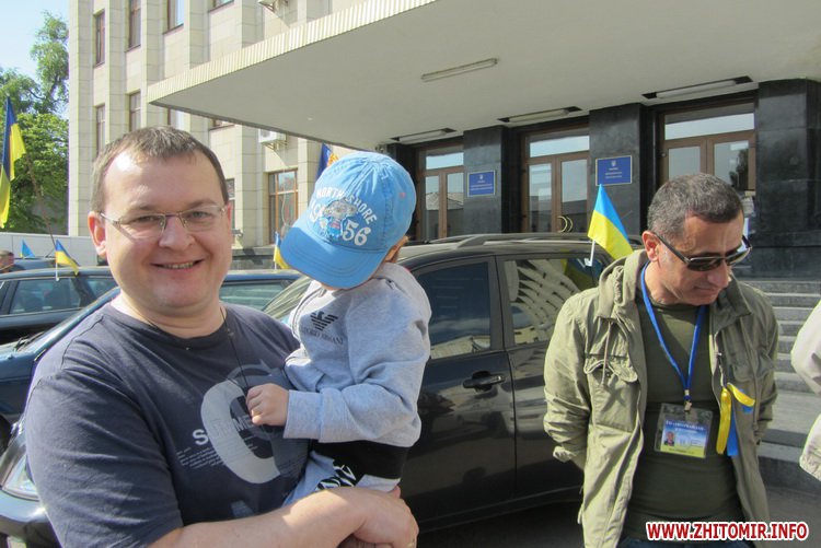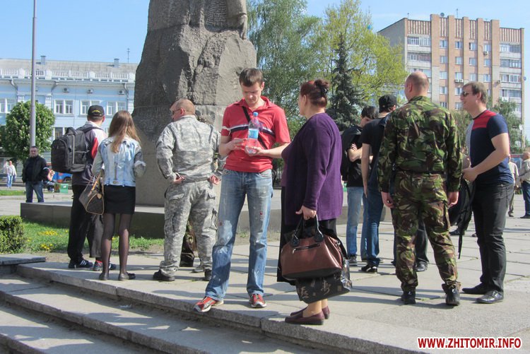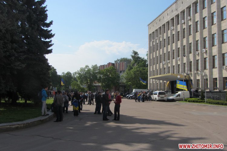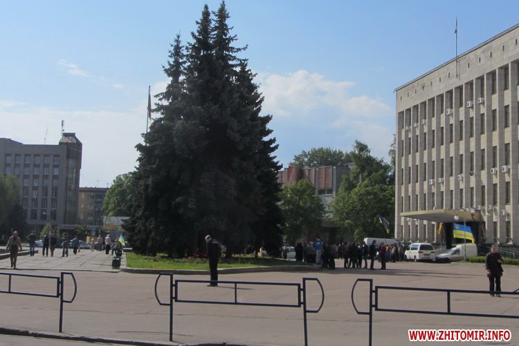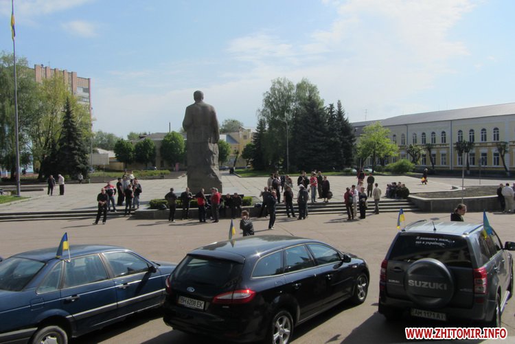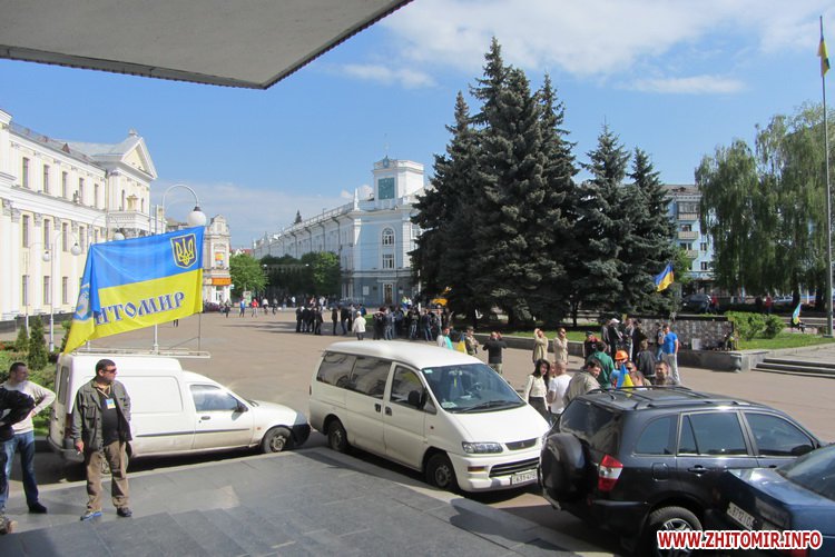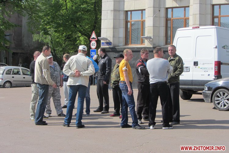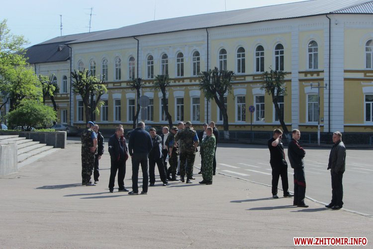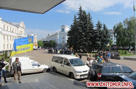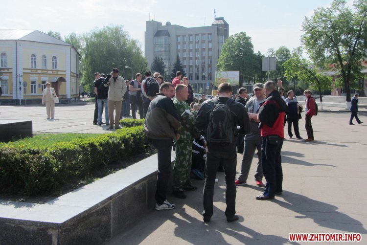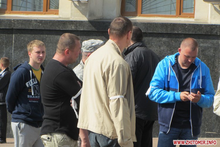 1 мая на площади Королева, возле здания Житомирской облгосадминистрации собралось около сотни человек и несколько машин Автомайдана. У некоторых мужчин на руках повязаны белые ленточки.