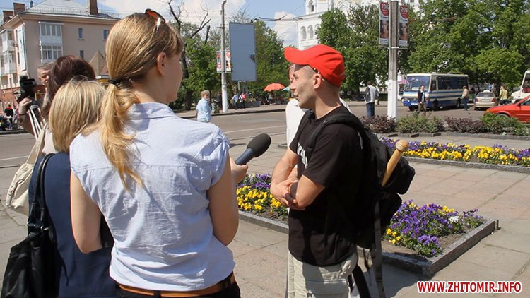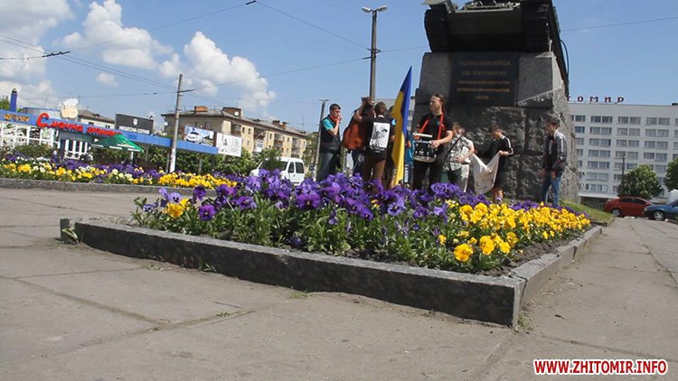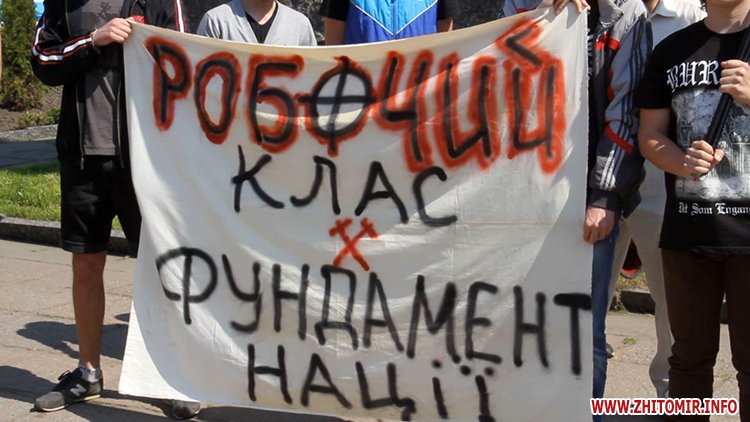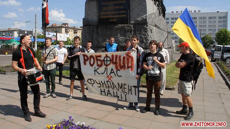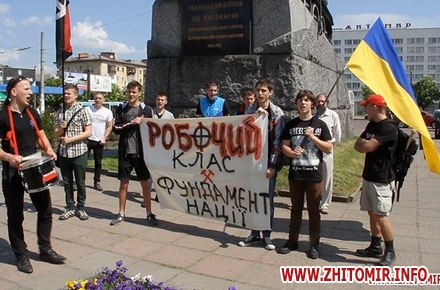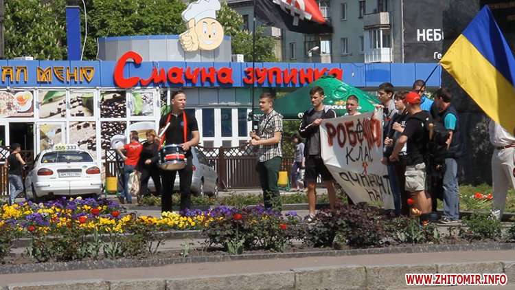 Десяток активістів формації «Автономні націоналісти Житомира» зібралися на майдані Перемоги, щоб показати перехожим, що 1 травня – це не комуністичне свято, а день людей праці. В руках вони тримали прапори, били у барабан і вигукували гасла «Травень, праця, націоналізм», «Україні слава, Путіну - смерть».