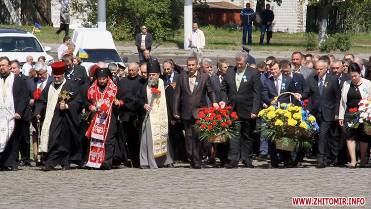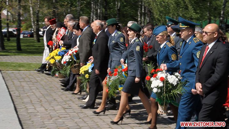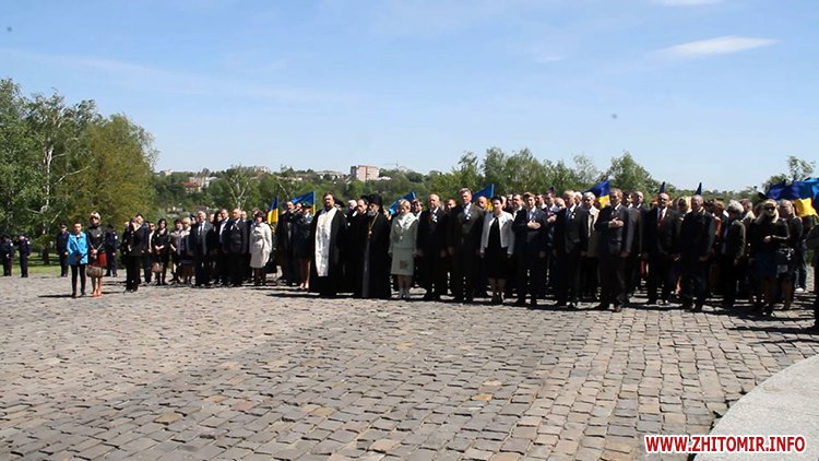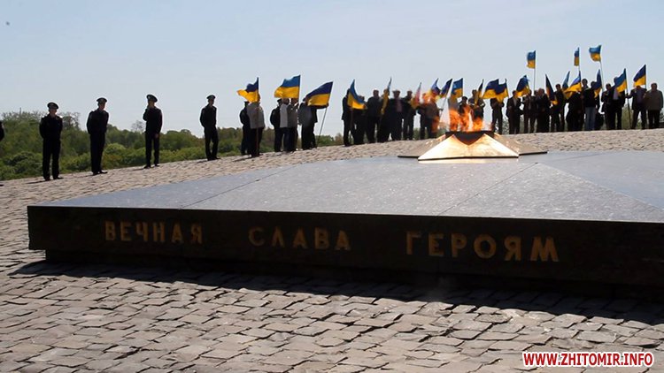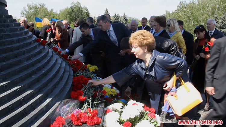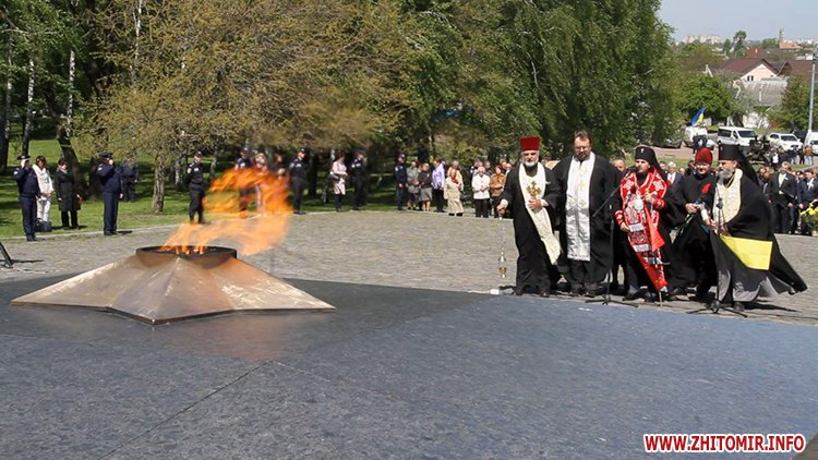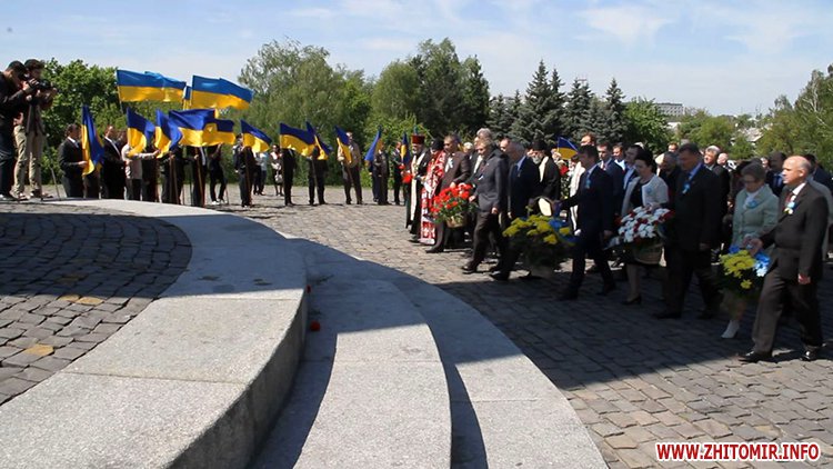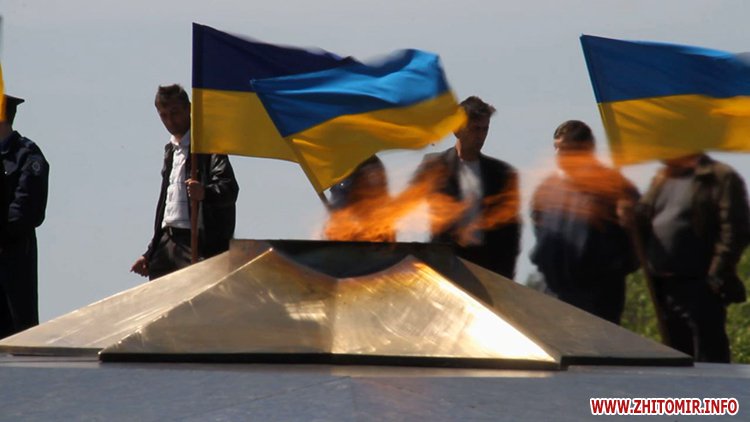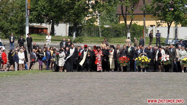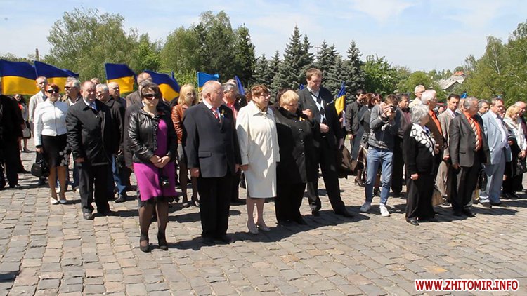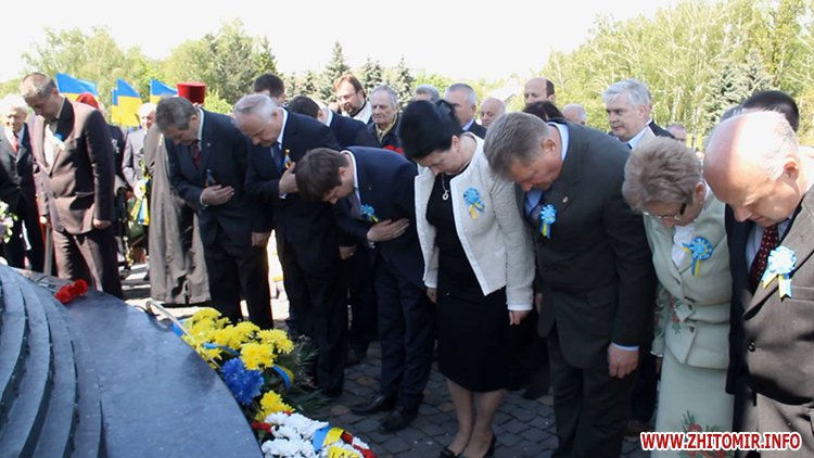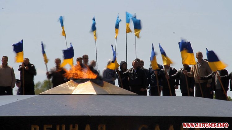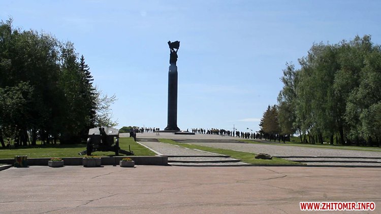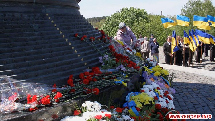 Кілька сотень житомирян прийшли опівдні 8 травня до Монументу Слави, щоб вшанувати пам'ять про загиблих у роки Другої світової війни.