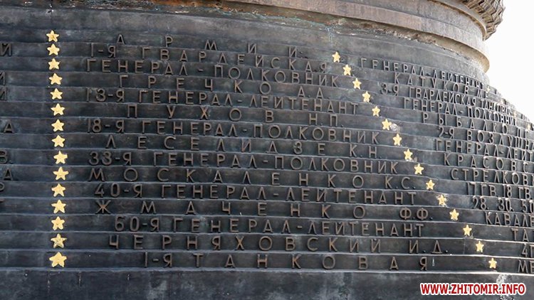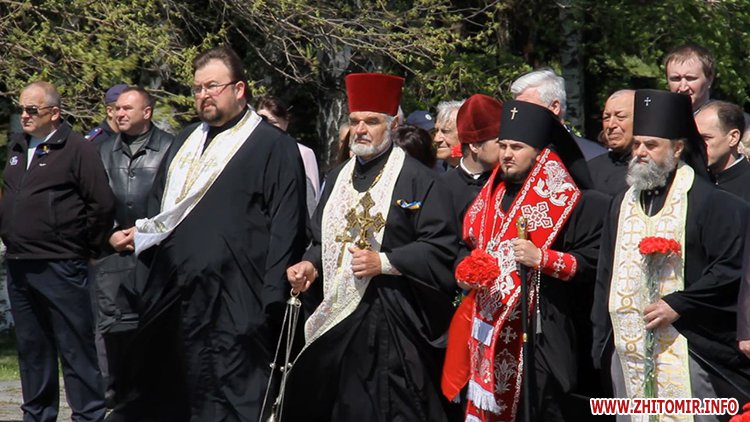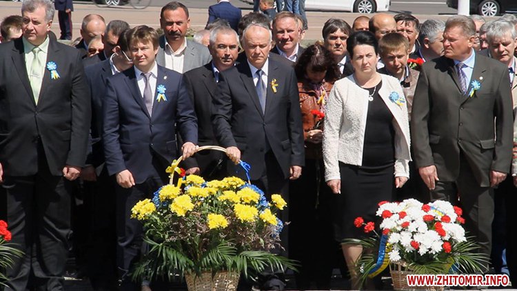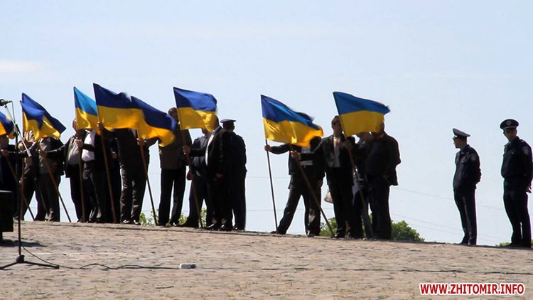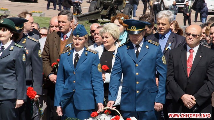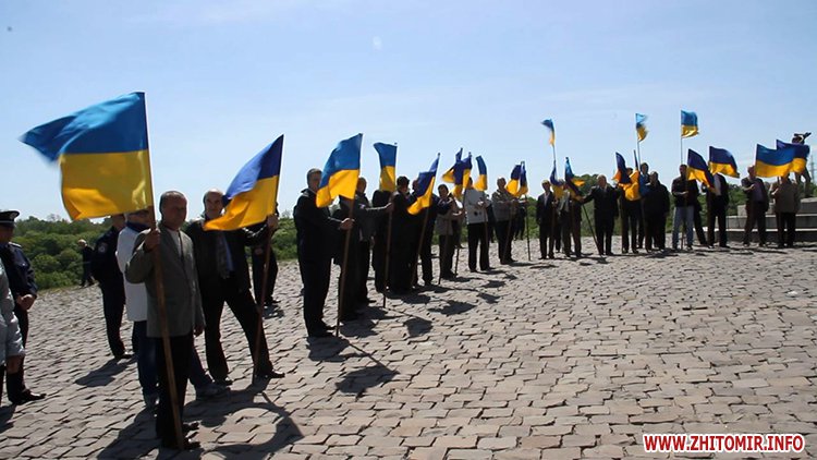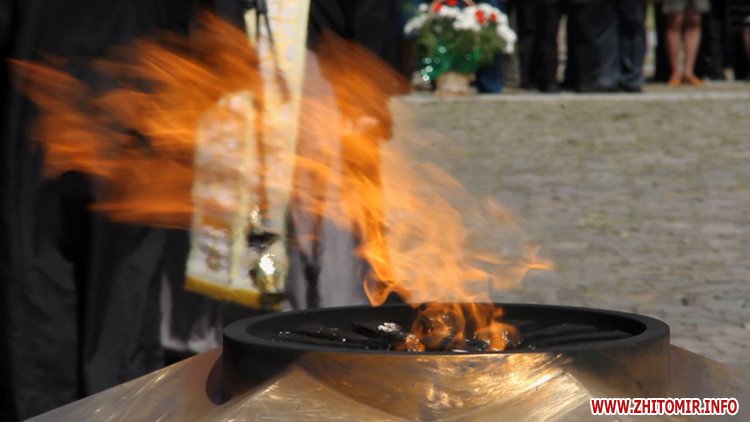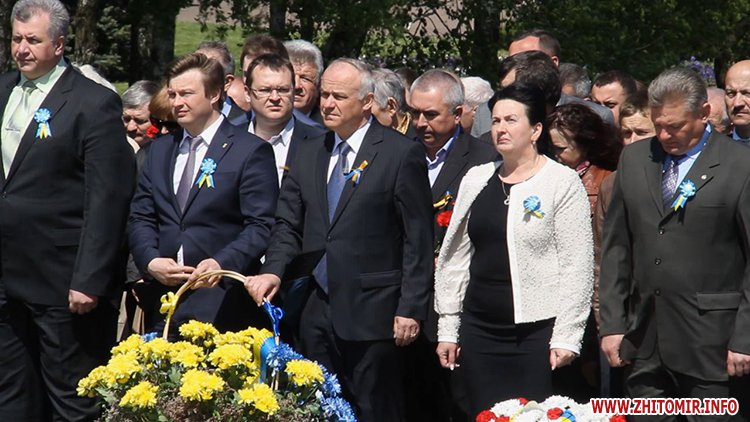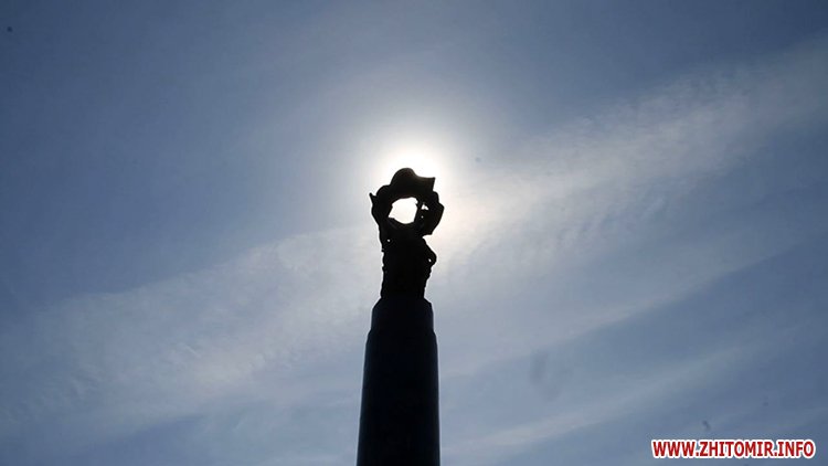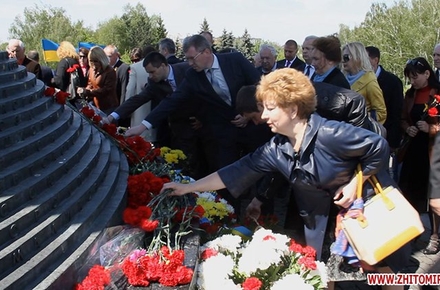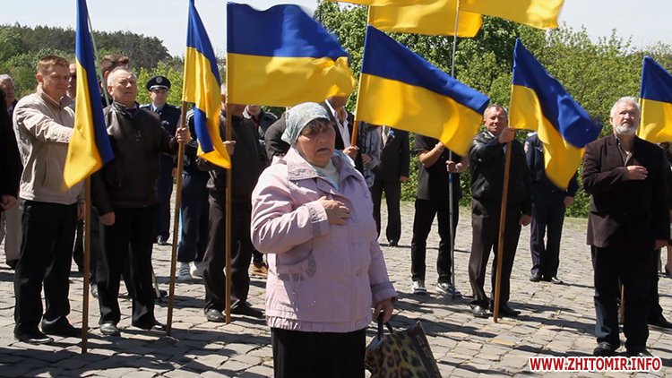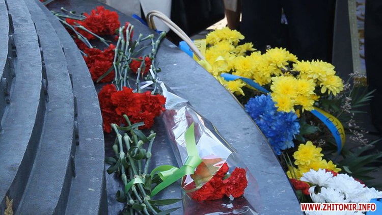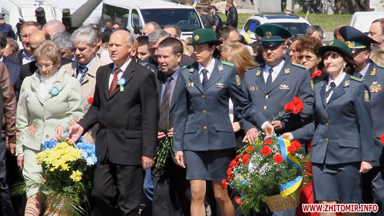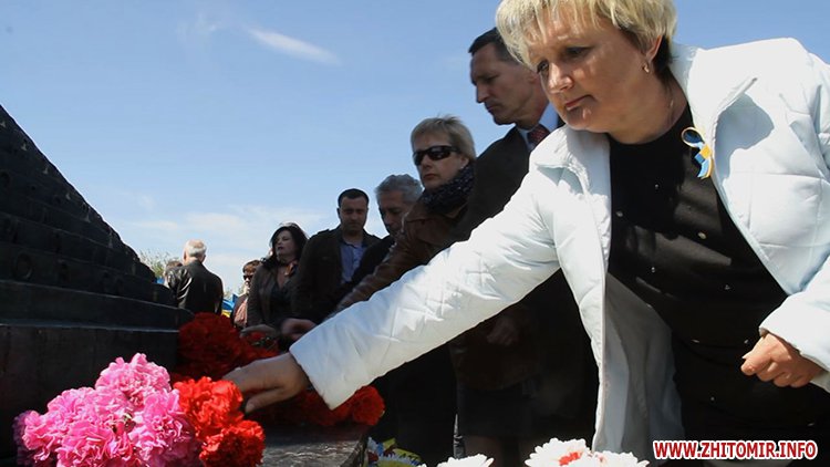 Кілька сотень житомирян прийшли опівдні 8 травня до Монументу Слави, щоб вшанувати пам'ять про загиблих у роки Другої світової війни.