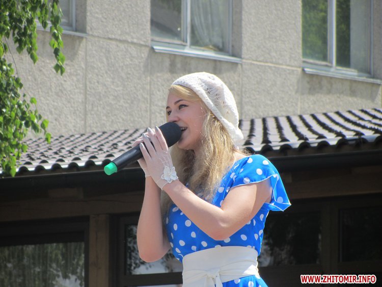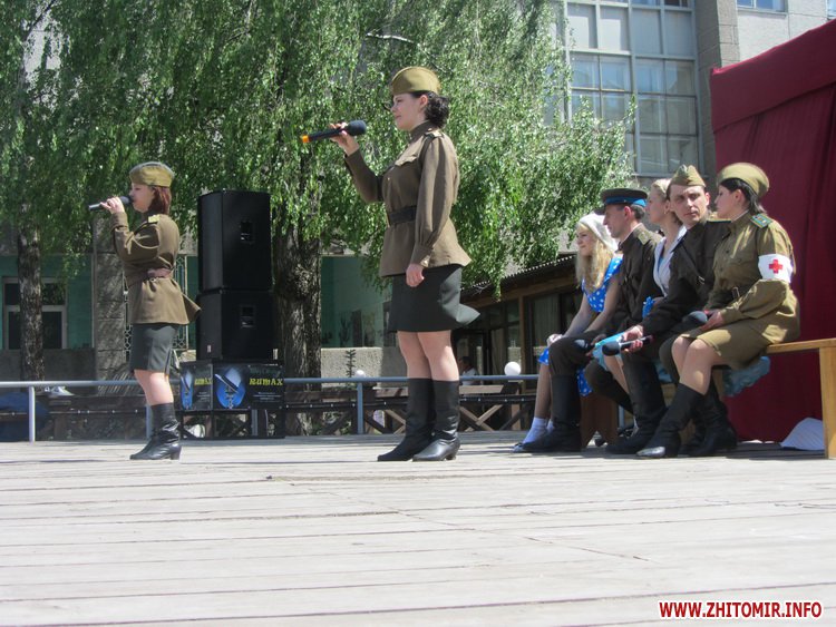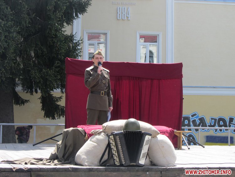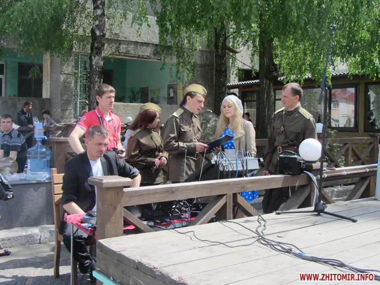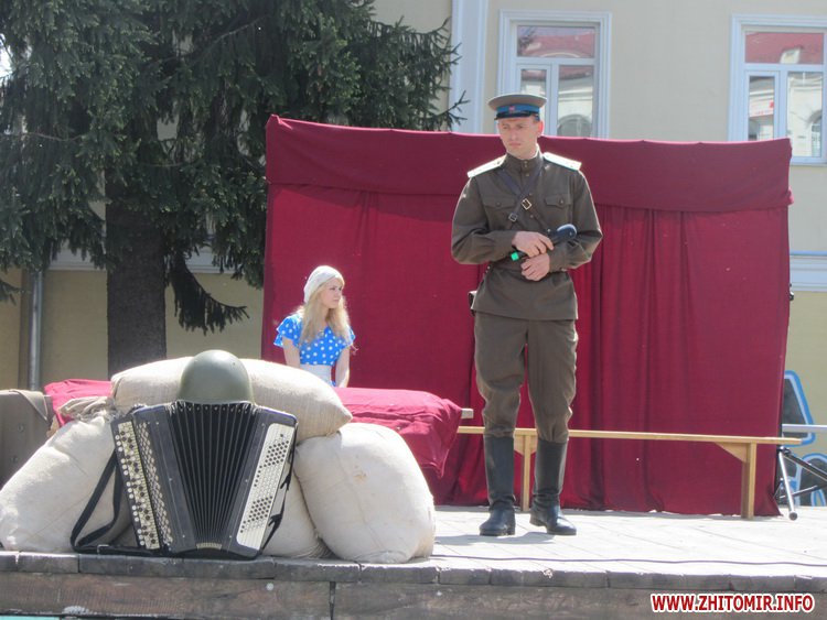 Учасники концерту у стилізованому одязі зі сцени вітають житомирян зі святом та виконують пісні, присвячені Великій Перемозі.