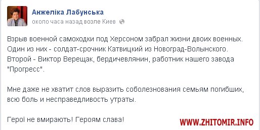 На странице в Facebook нардепа Анжелики Лабунской есть информация о погибших. Один из них – старший солдат срочной службы Владимир Котвицкий из Новограда-Волынского, второй – сержант-резервист Виктор Верещак из села Никоновка Бердичевского района, рабочий завода «Прогресс».
