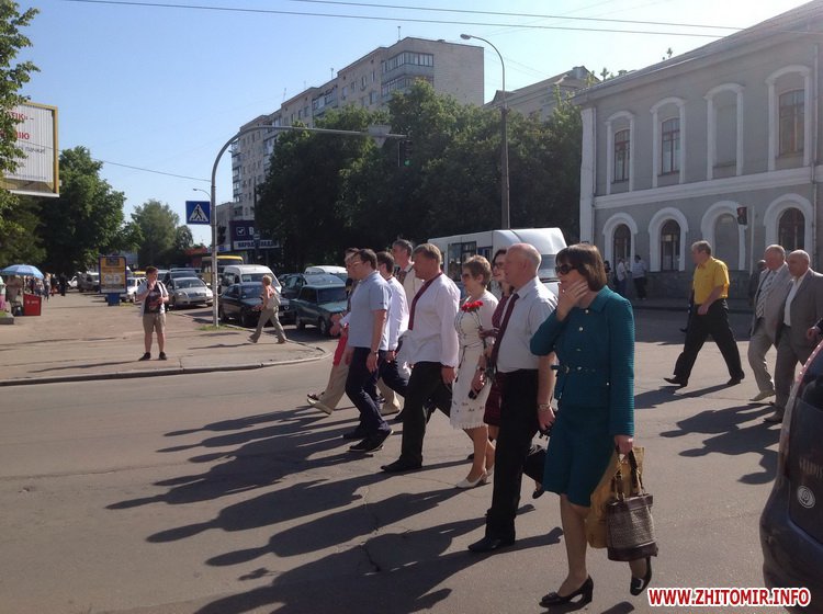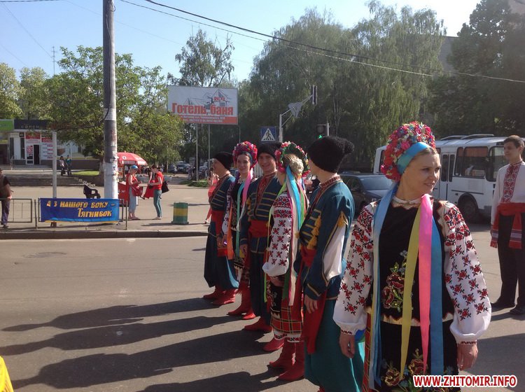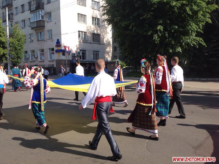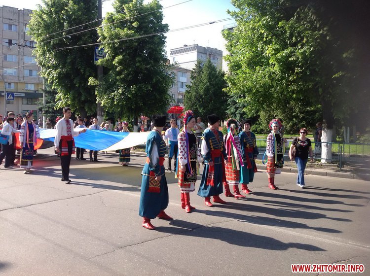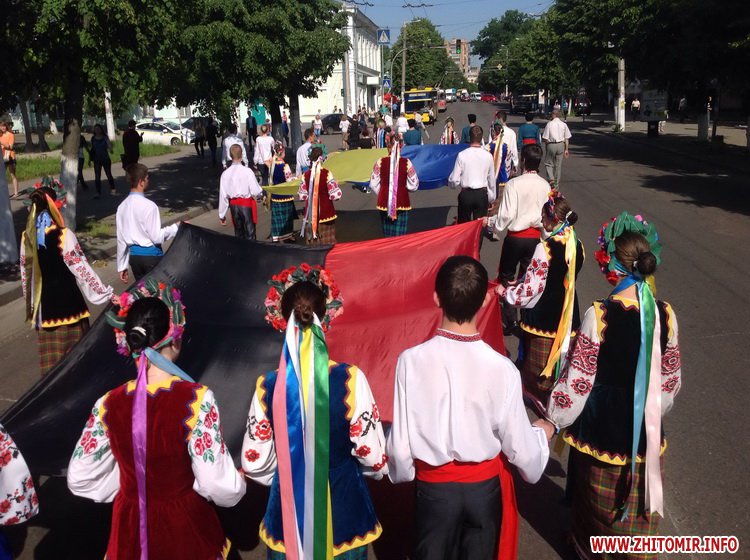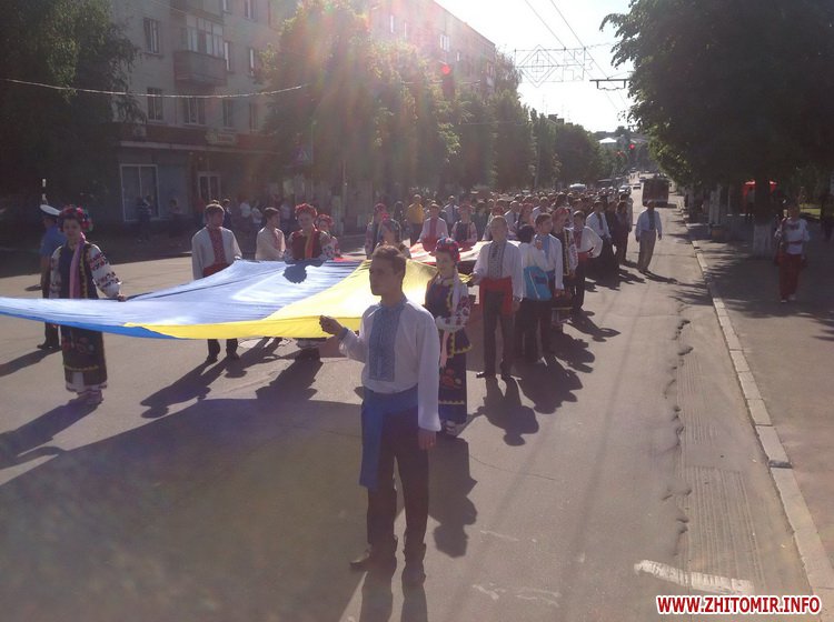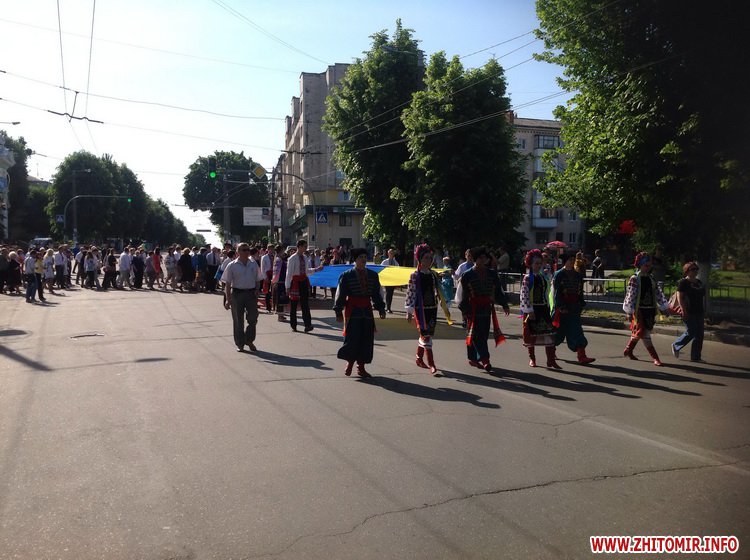 На чолі колони рухалися молоді люди, які несли два стяги - жовто-блакитний і червоно-чорний. За ними йшли житомирські чиновники та духовенство. Майже всі учасники ходи одягнені у вишиванки. Автомобілісти сигналять, вітаючи колону.