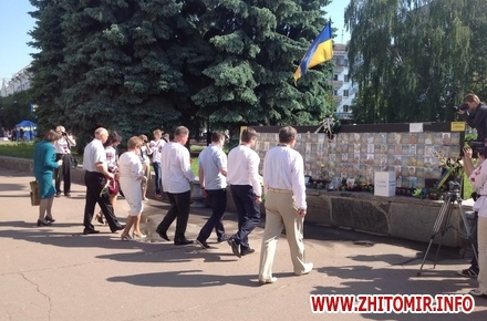 Житомиряни також поклали квіти та вшанували пам’ять Олега Ольжича, Миколи Сціборського і Омеляна Сеника, після чого колона рушила до Свято-Михайлівського кафедрального собору, де люди молитимуться за душі загиблих героїв України.