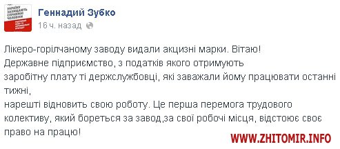 «Лікеро-горілчаному заводу видали акцизні марки. Державне підприємство, з податків якого отримують заробітну плату ті держслужбовці, які заважали йому працювати останні тижні, нарешті відновить свою роботу», - написав Зубко.