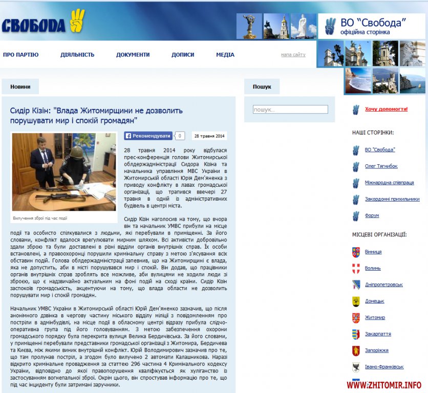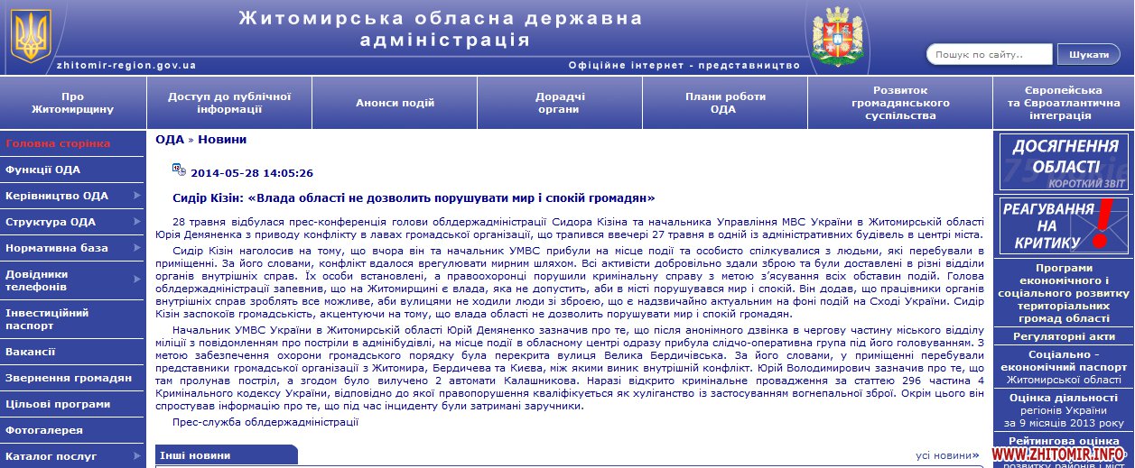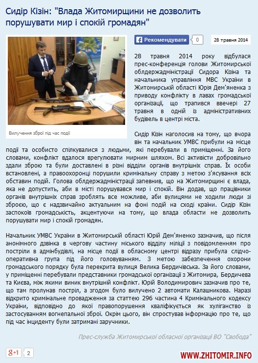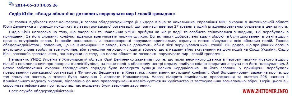 В сообщении говорилось о пресс-конференции губернатора Житомирской области Сидора Кизина и начальника УМВД Украины в Житомирской области Юрия Демьяненко по поводу конфликта с применением оружия, который произошел вечером 27 мая в штабе Правого сектора в центре Житомира.