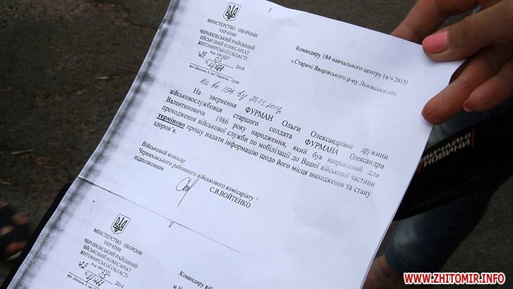 Щоб дізнатися про результати тижневих пошуків, Ольга Фурман вкотре навідується у Черняхівський районний військкомат. Там з’ясовує, що за 7 днів справа так і не зрушила з місця. Жінці пояснюють, що треба звертатися до командування частини, а ще вперше за тиждень пропонують написати заяву і обіцяють у найближчі дні надіслати відповідь.