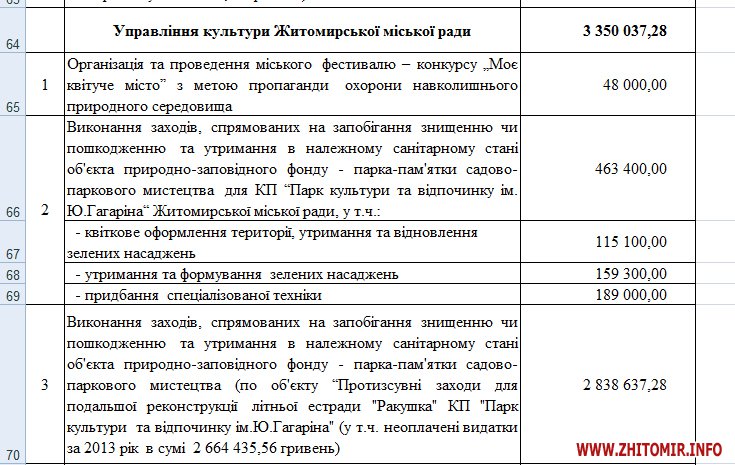 «Выполнение мероприятий, направленных на предотвращение уничтожения или повреждения и содержание в надлежащем санитарном состоянии объекта природно-заповедного фонда – парка-памятника садово-паркового искусства (по объекту «Противооползневые меры по дальнейшей реконструкции летней эстрады «Ракушка» КП «Парк культуры и отдыха им.Ю.Гагарина» (в т.ч. неоплаченные расходы 2013 в сумме 2664 435,56 гривен)», - так записан пункт о выделении денег за работы, которые, по словам Сухомлина, были выполнены и оплачены в прошлом году.