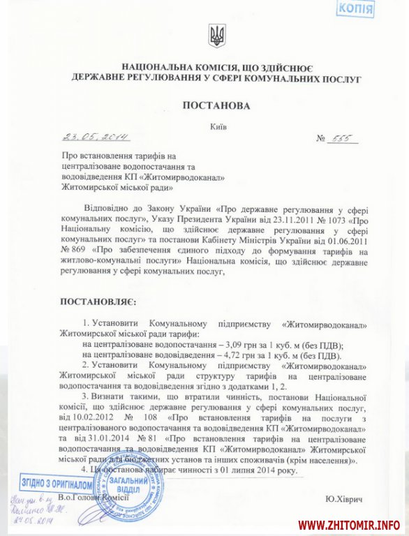 «Установити КП «Житомирводоканал» Житомирської міськради тарифи: на централізоване водопостачання – 3,09 грн. за 1 куб.м (без ПДВ), на централізоване водовідведення – 4,72 грн. за 1 куб.м (без ПДВ)», - йдеться в постанові Нацкомісії.