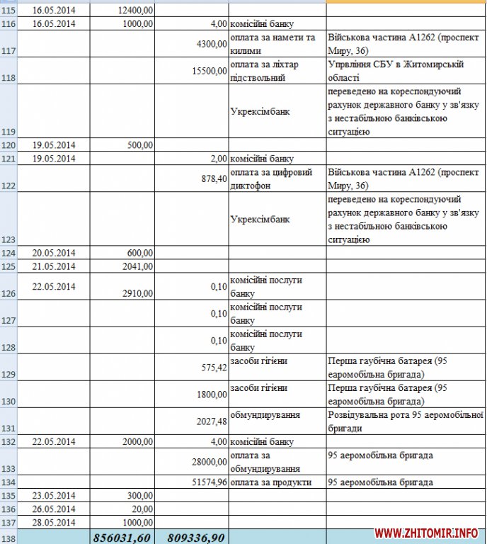 По состоянию на 28 мая на счет фонда поступило 856 тыс. 31,60 грн, из которых уже потрачено 809 тыс. 336,90 грн., остаток – 46 тыс. 694,70 грн. Самые дорогостоящие покупки за последние две недели – продукты для 95-й аэромобильной бригады (51,6 тыс.грн.), обмундирование для этой же бригады (28 тыс.грн.) и подствольный фонарь для областного управления СБУ (15,5 тыс.грн.).