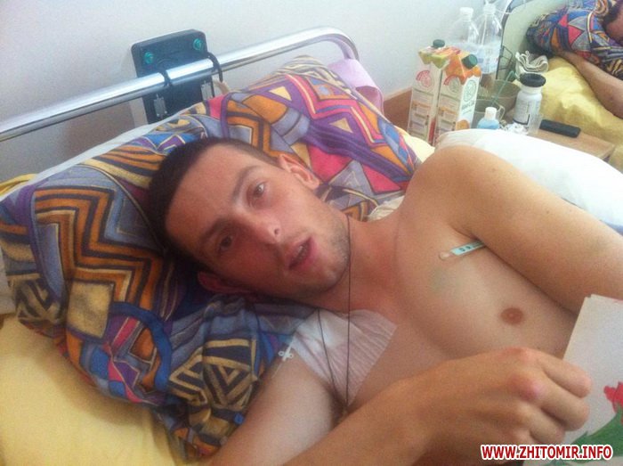 Участник АТО на Востоке Украины Ящук Максим Владимирович, 1991 года рождения, 2 недели назад был ранен возле Славянска в спину. Повреждены позвоночник и внутренние органы. В результате тяжелой травмы позвоночника отказали ноги. Единственный сын у матери. Мать работает на швейной фабрике в Коростене, сама воспитывает сына.