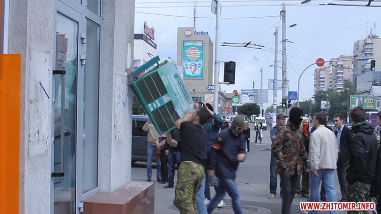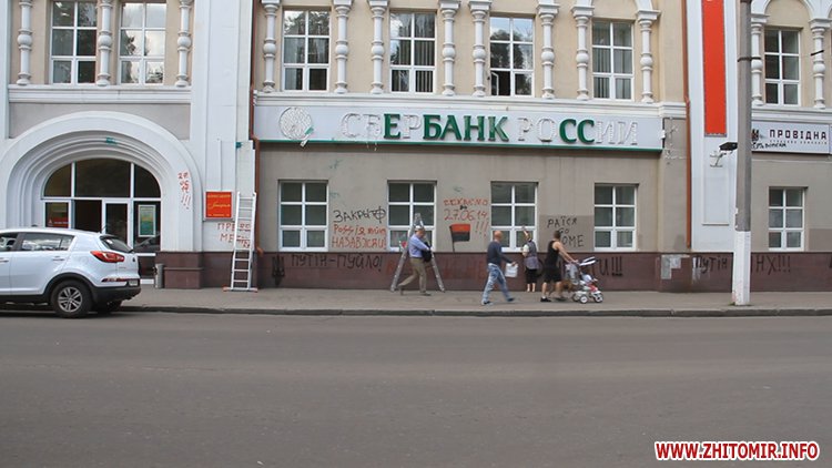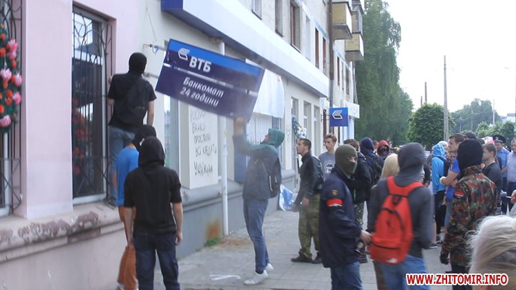 Как сообщал Житомир.info, 20 июня в пяти отделениях российских банков, которые находятся в центре Житомира, повредили вывески, разрисовали фасады, забросали яйцами и облили зеленкой окна и банкоматы. Активное участие в этом принимали представители Правого сектора.