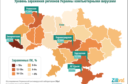 Об этом сообщает украинская антивирусная лаборатория «Zillya!», которая составила карту вирусной активности на территории Украины за период с марта по июнь 2014 года.