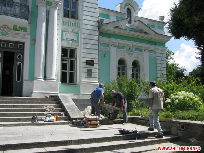 На благоустройство территории и замену фасадной лестницы выделено 837,5 тыс. грн. Отреставрирован фонтан, благоустроен задний двор, рабочие ремонтируют центральную лестницу.