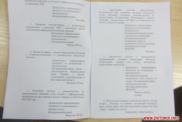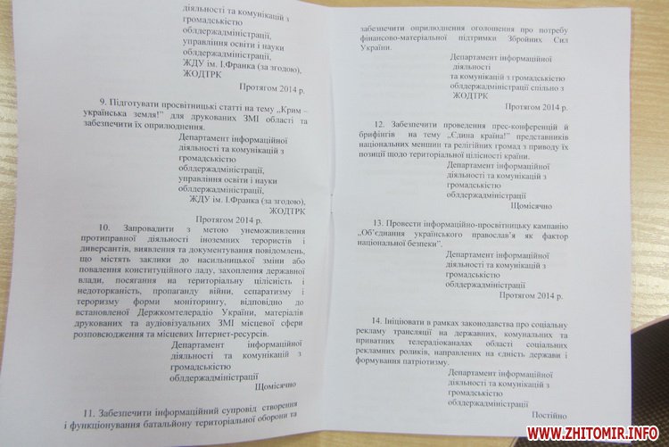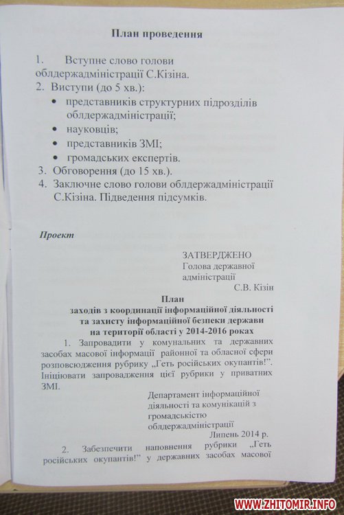 Проект плану заходів з координації інформаційної діяльності та захисту інформаційної безпеки держави 25 червня обласна влада запросила обговорити науковців, представників ЗМІ, громадських експертів та керівників структурних підрозділів облдержадміністрації: департаменту інформаційної діяльності та комунікацій з громадськістю; департаменту сім’ї, молоді та спорту; департаменту економічного розвитку, торгівлі та міжнародного співробітництва; управління культури та управління освіти і науки.