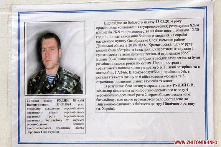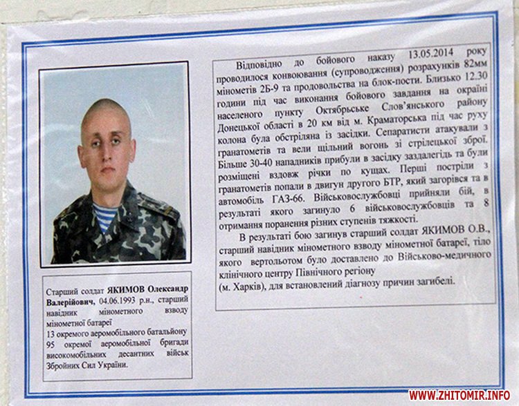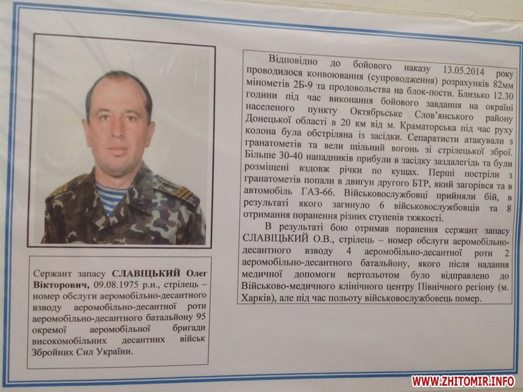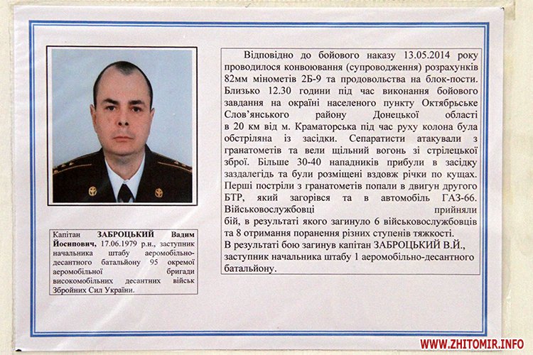 - капітан Заброцький Вадим Йосипович, 17.06.1979 р.н., м. Житомир. Заступник начальника штабу 1 аеромобільно-десантного батальйону. Загинув 13 травня на околиці села Октябрське (Слов'янський район), що за 20 км від Краматорська. Під час руху колона десантників, яка супроводжувала розрахунки 82-мм мінометів та продовольство на блокпости, близько 12:30 була обстріляна терористами зі заздалегідь підготовлених позицій з підствольних гранатометів та щільним прицільним вогнем зі стрілецької зброї. Похований у селі Світин Житомирського району. Залишились дружина, дві доньки 2004 та 2005 р. н.