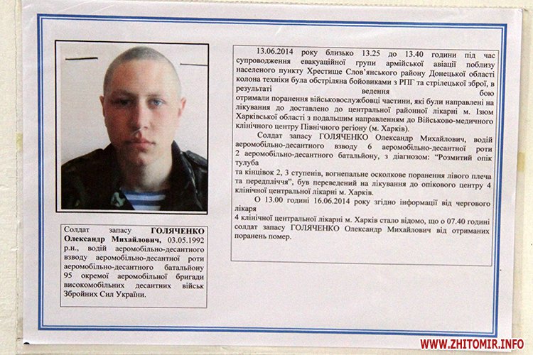 - солдат запасу Голяченко Олександр Михайлович, 03.05.1992 р.н., с. Славів Черняхівського району. Водій аеромобільно-десантного взводу 6 аеромобільної-десантної роти 2 аеромобільно-десантного батальйону. 13 червня поблизу с. Хрестище Словянського району колона техніки потрапила під обстріл з РПГ та стрілецької зброї. В результаті бою отримав опіки тулуба і кінцівок 2-3 ступеню та вогнепальне осколкове поранення. Помер 16 червня в Харківському госпіталі. Похований в селі Славів Черняхівського району.