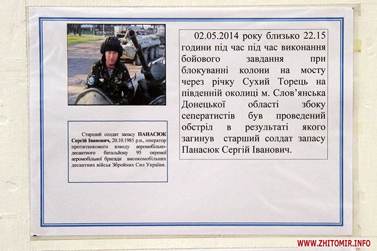 - старший солдат Панасюк Сергій Іванович, 20.10.1985 р.н. м. Коростишів. Оператор протитанкового взводу 1 аеромобільно-десантного батальйону, мобілізований. Загинув 2 травня у районі села Андріївка поблизу Слов'янська від кулі снайпера під час нападу групи озброєних екстремістів, які прикривалися місцевими мешканцям. Похований у Коростишеві.