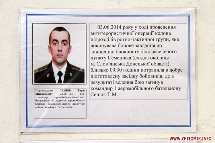 - підполковник Сенюк Тарас Михайлович, 22.06.1980 р.н., м. Житомир. Командир 1 аеромобільного батальйону. Загинув 3 червня поблизу села Семенівка під Слов’янськом, під час обстрілу терористами колони українських військових, що рухалась з міста Ізюм. Похований у Коломиї, Івано-Франківської області, звідки родом.