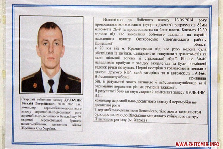 - старший лейтенант запасу Дульчик Віталій Георгійович, 30.04.1986 р.н., м. Бердичів. Командир аеромобільно-десантного взводу 4 аеромобільно-десантної роти. Загинув 13 травня на околиці села Октябрське (Слов'янський район), що за 20 км від Краматорська. Похований на військовому кладовищі у Житомирі. Залишилась дружина.