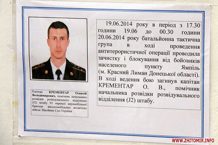 - капітан Крементар Олексій Володимирович, 26.11.1983 р.н., м. Житомир. Помічник начальника розвідки розвідувального відділення J2 штабу. Загинув 19 червня під час проведення зачистки та блокування від бойовиків с. Ямпіль поблизу Красного Лиману Донецької області. Похований на військовому кладовищі м. Житомира. Залишилась дружина, донька та двоє синів.