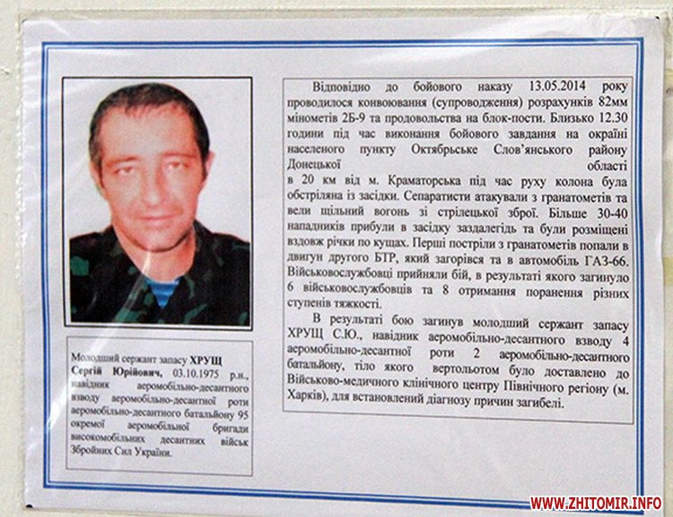 - молодший сержант запасу Хрущ Сергій Юрійович, 03.10.1975 р.н., село Верхівня Ружинський район. Навідник аеромобільно-десантного взводу 4 аеромобільно-десантної роти 2 аеромобільно-десантного батальйону, мобілізований. Загинув 13 травня на околиці села Октябрське (Слов'янський район), що за 20 км від Краматорська. Похований у селі Верхівня Ружинського району. Залишились дружина та двоє дітей.