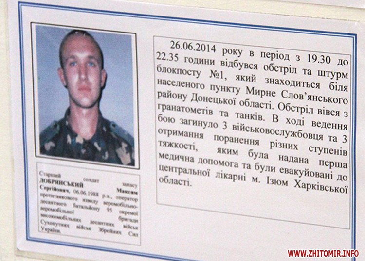 - старший солдат запасу Добрянський Максим Сергійович, 06.06.1988 р.н., м. Коростишів. Оператор протитанкового взводу аеромобільно-десантного батальйону. Загинув 26 червня під час обстрілу та штурму блокпосту №1 поблизу села Мирне Слов’янського району. Обстріл вівся з гранатометів та танків.